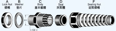 ·产品材质: A.C.F部分以UL认可之尼龙PA66制成(防火等级UL94V-2),B及D部分采用EPDM耐候橡胶制成。